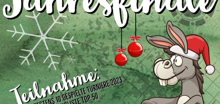 Jahresfinale am 04.01.2024 um 14:00 Uhr Startgebühr: 15€ (für die Dealer) Teilnahmebedingung: Mindestens 10 gespielte Turniere 2023 und in der Rangliste unter den Top 50. Preise: im Wert von 2500€ ...