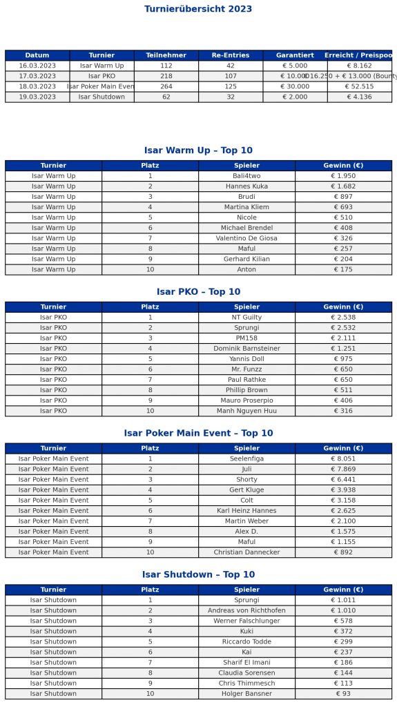 Besonders das Main Event wurde zum echten Magneten und unterstrich eindrucksvoll, warum das Isar-Poker Festival inzwischen als Fixpunkt im Pokerkalender gilt. Mit professioneller Organisation, einzigartiger Atmosphäre und großem Zuspruch war 2023 das Jahr, in dem das Festival endgültig zu den wichtigsten Poker-Events der Region aufstieg. 🌟