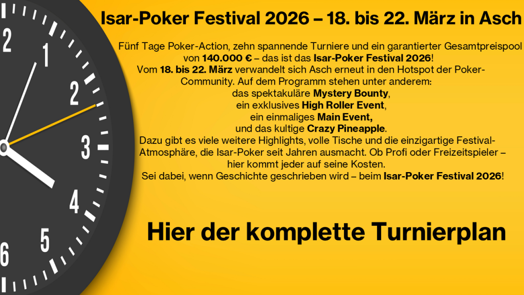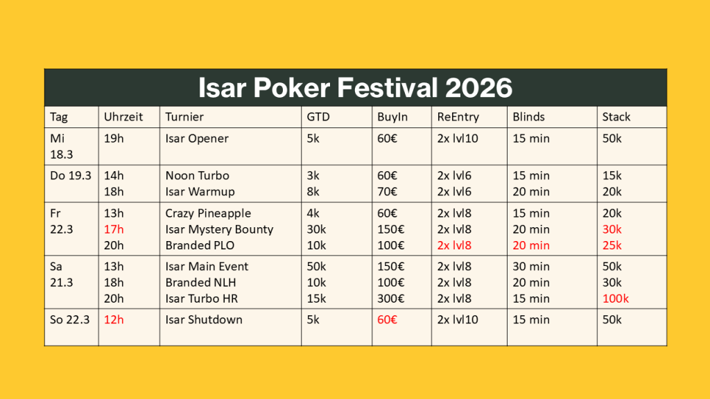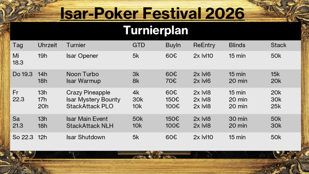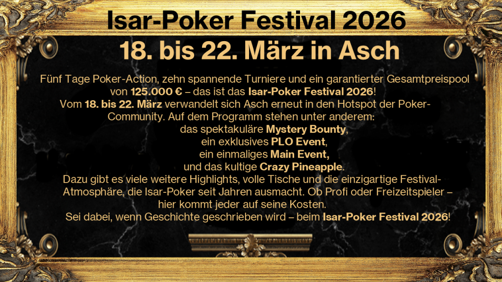 Seit 2019 ist das Isar-Poker Festival ein fixer Bestandteil m Grand Casino As – und inzwischen einfach nicht mehr wegzudenken. Was damals als erste gemeinsame Runde begann, hat sich zu einer echten Tradition entwickelt: spannende Pokerabende, volle Tische und jede Menge Festival-Feeling.